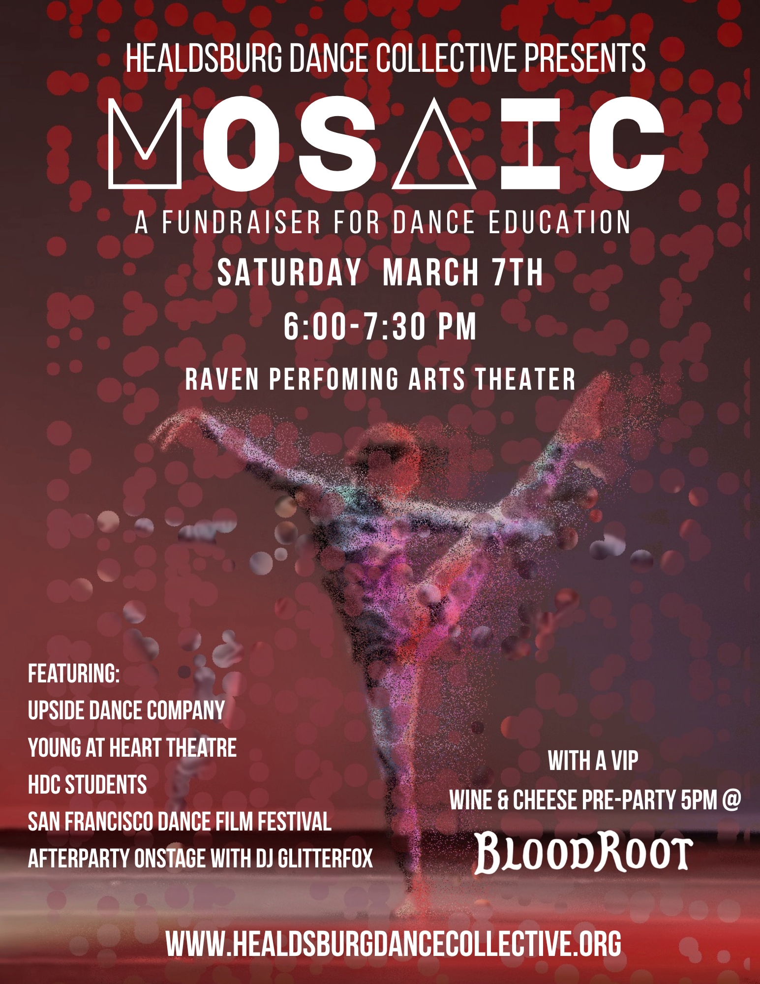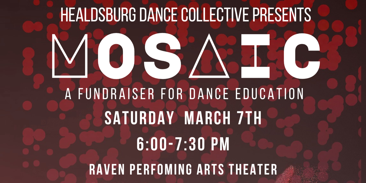 Saturday March 7th from 6:00-7:30pm Healdsburg Dance Collective presents its 4th annual show MOSAIC: A fundraiser for Dance Education at the Raven Performing Arts Theater in Healdsburg.